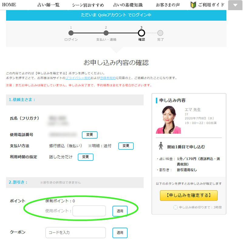 電話占い HOME > ヘルプ > ネット受付 > ネット受付(利用前) > ポイント割引はどこで申し込みますか?