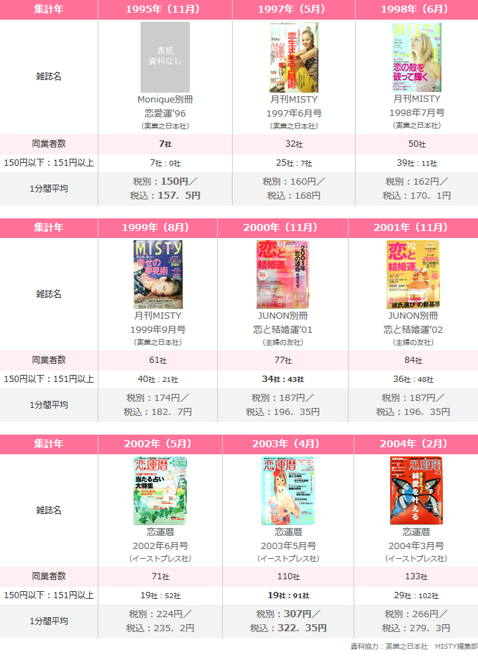 1995年までは弊社を含め業者の数も少なく、対面占いの相場と同等の20分3000円・1分間150円(税別)と言う料金設定が相場でした。ところが業者数の増加と比例し、特に2000年以降