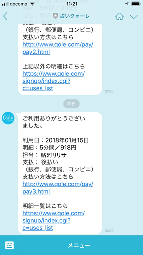 2018年2月よりクォーレのネット受付とLINE公式アカウントを「連携」することで、占い電話相談の明細などをLINEで確認できます。